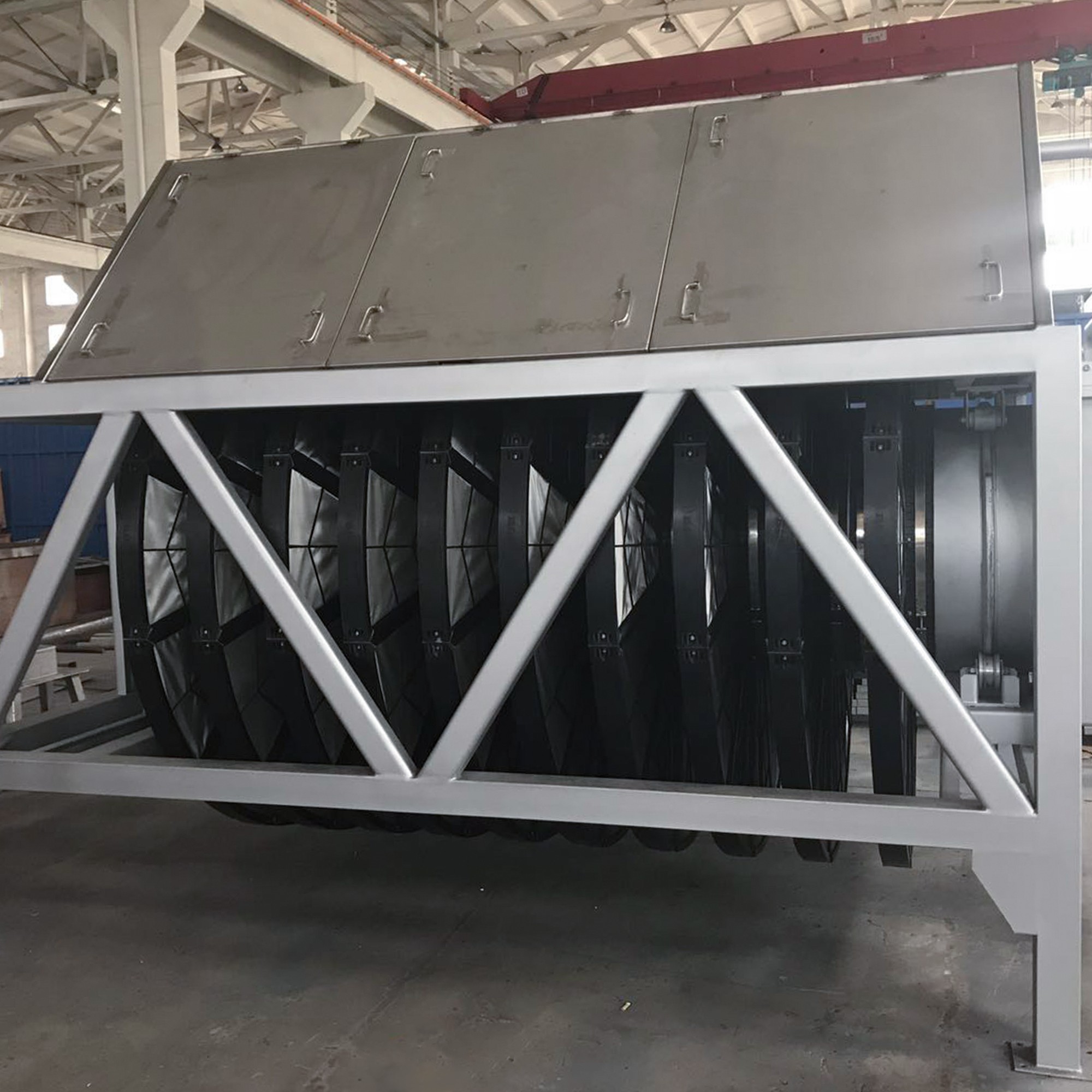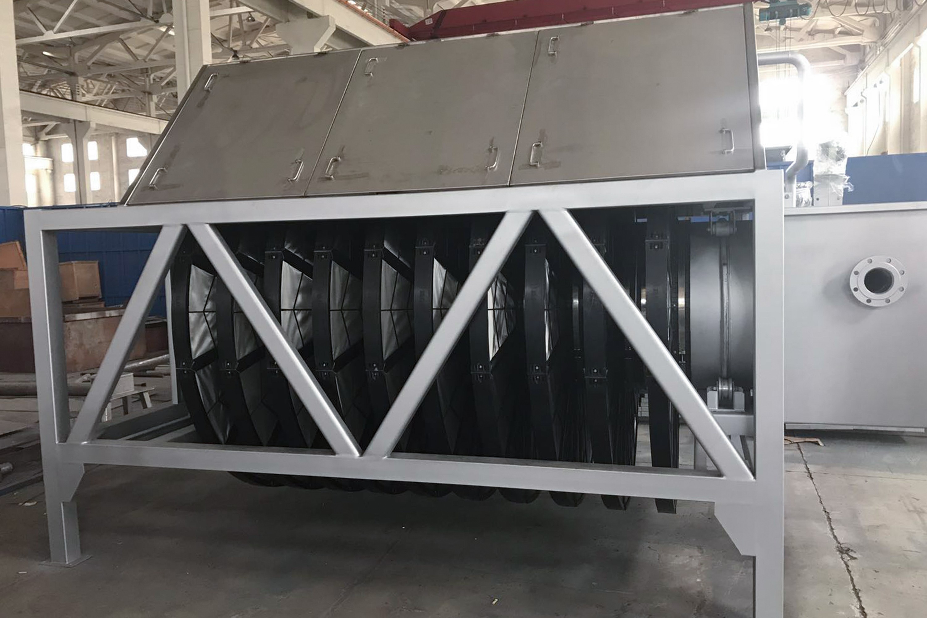 濾布濾池:該系統(tǒng)包括混泥土池體、進(jìn)水堰箱、出水可調(diào)堰板、支撐軸座、中空設(shè)備主體(等邊六角形或者圓形)、纖維濾盤、支撐滑輪、出水口密封組件、排污系統(tǒng)、驅(qū)動裝置、自動化控制系統(tǒng)。設(shè)備主體端部與支撐軸座法蘭連接,出水管置于支撐滑輪上,并安裝出水密封組件;纖維濾盤垂直安裝在設(shè)備主體上;濾盤內(nèi)部設(shè)有骨架,用于支撐包裹在外面的濾布,骨架中空,并與設(shè)備主體連接固定后形成一個(gè)外部密封,內(nèi)部中空的整體;排污系統(tǒng)包括池底排污和濾盤反洗,每個(gè)濾盤的兩側(cè)設(shè)有反抽吸裝置。運(yùn)行時(shí),污水經(jīng)過進(jìn)水堰箱,均勻進(jìn)入濾池,由外向內(nèi)通過濾盤,由濾盤上的濾布截留污物后的凈水進(jìn)入中空設(shè)備主體,然后排出池外。