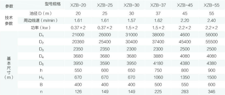 XZB型吸泥機一般用于大型(一般指流量大于500m3/h)    污水處理工程的幅流式沉淀池,特別適用于二沉池池底污 泥的刮集及外排。池形一般采用中心進水、周邊出水、中 心排泥,池底可不設坡度(平底結(jié)構(gòu)),二沉池使用尤為廣 泛。水面浮渣、浮沫等雜物可由浮渣刮集裝置刮排至池外 渣坑或渣斗。靜壓排泥依靠各個管口閥門,調(diào)節(jié)流量流至 中心泥缸直接外排。虹吸排泥主要是利用真空泵抽真空進 行二次虹吸提升排泥力矩變化范圍較大的場合,可采用帶力矩保護裝置的軸裝 式減速機。